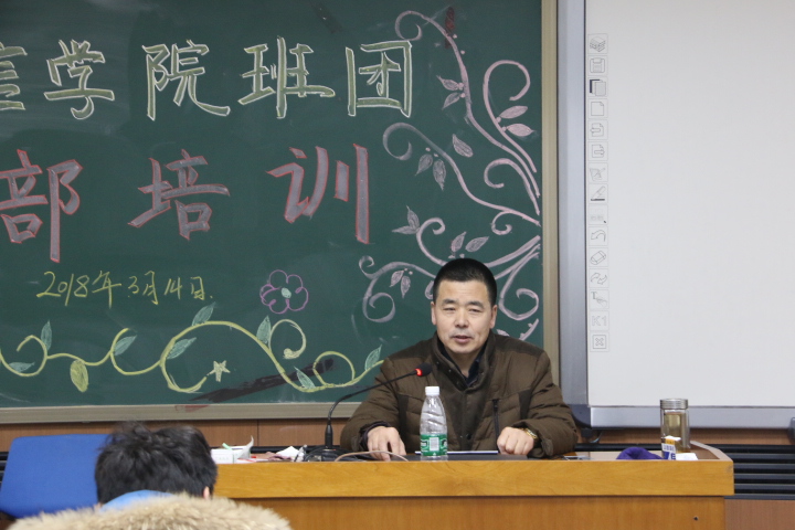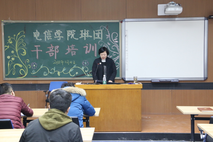 2018年3月14日,电信学院班团干部培训在一教二楼报告厅举行,团委书记付大伟主持。本次培训由学院党委田东代书记主讲:(主题是)学习习近平同志新时代社会主义思想,做政治合格的学生干部。学工辅导员及80余名班团、学生会干部参加了培训。